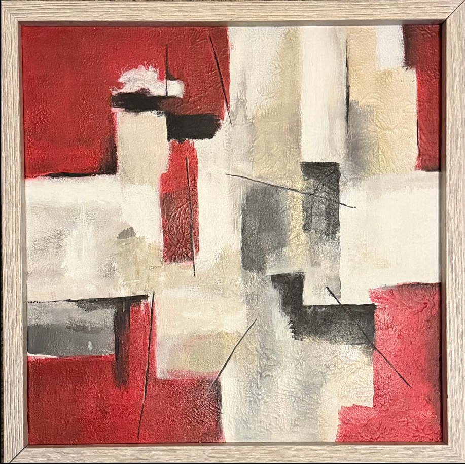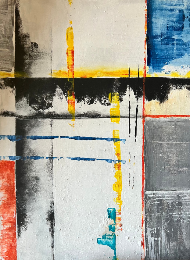 In deze werken onderzoek ik de vrijheid van vorm en kleur. Vlakken, lijnen en structuren vormen samen een compositie die je als kijker zelf mag interpreteren. Deze schilderijen ontstaan vanuit intuïtie en spel, en laten zien hoe kleur en vorm een verhaal kunnen vertellen zonder herkenbare beelden.